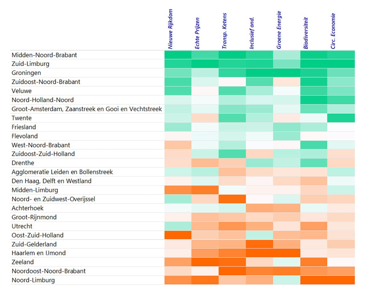 In de NEx-T Index van het onderzoek staan alle indicatoren voor Hart van Brabant (Midden-Noord-Brabant) op groen. De regio scoort het hoogst op de combinatie van economische, sociale en ecologische doelstellingen, en op aspecten als helder inzicht in ketens en aandacht voor biodiversiteit. Ook inclusief ondernemen (als afspiegeling van de samenleving) en circulair ondernemen (waarde creëren met reststoffen) zijn bovengemiddeld ontwikkeld, evenals groene (herbruikbare) energie en echte (eerlijke) prijzen.