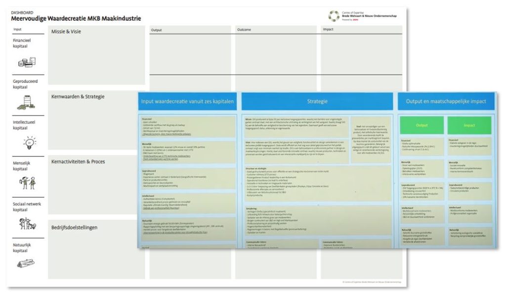 Het dashboard is geen losstaand instrument, maar onderdeel van een bredere aanpak. We ontwikkelden ook een theoretisch en een praktisch boek waarin het model wordt uitgelegd. Bedrijven kunnen hulp krijgen van studenten die met het model werken. Tijdens masterclasses bouwden we het stap voor stap op: eerst het model uitleggen, dan toepassen op het bedrijf, en daarna het dashboard gebruiken.”