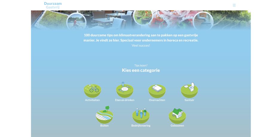 Op Duurzaam Gastvrij staan 100 praktische tips voor ondernemers in horeca en recreatie. Centraal in de tips staat de gastvrije invulling van duurzaamheid. De tips zijn ondergebracht in categorieën die aansluiten bij de wereld van horeca- en leisure-ondernemers zoals buiten, eten en drinken of sanitair. Ook zijn er wegwijzers opgenomen die dieper ingaan op een klimaat-maatregel zoals groene parkeerplaatsen of duurzaamheidssubsidies. Daarnaast zijn er eerlijke verhalen in opgenomen waarin ondernemers vertellen waaróm zij duurzaam ondernemen en wat daarvan de voor- en nadelen voor hen zijn. De website is inmiddels ruim 1000 keer bezocht en veelvuldig gebruikt.