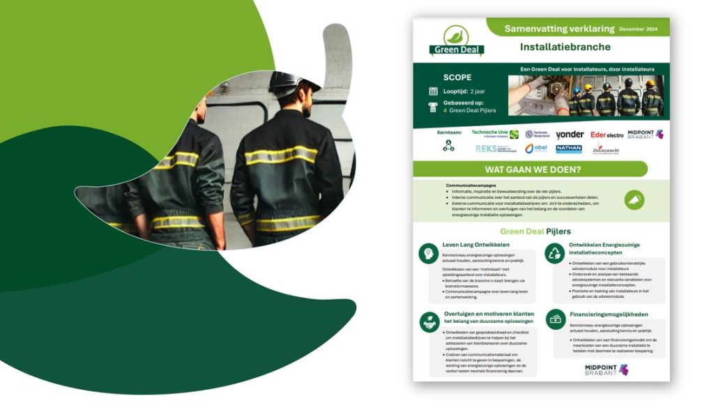 De Green Deal Installatiebranche is een samenwerkingsverband van verschillende stakeholders in de installatiebranche zoals installatiebedrijven, leveranciers technische installaties, onderwijs en de branchevereniging en Midpoint Brabant.