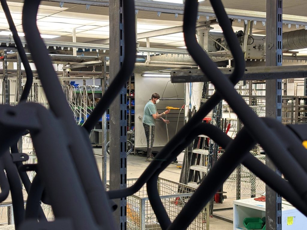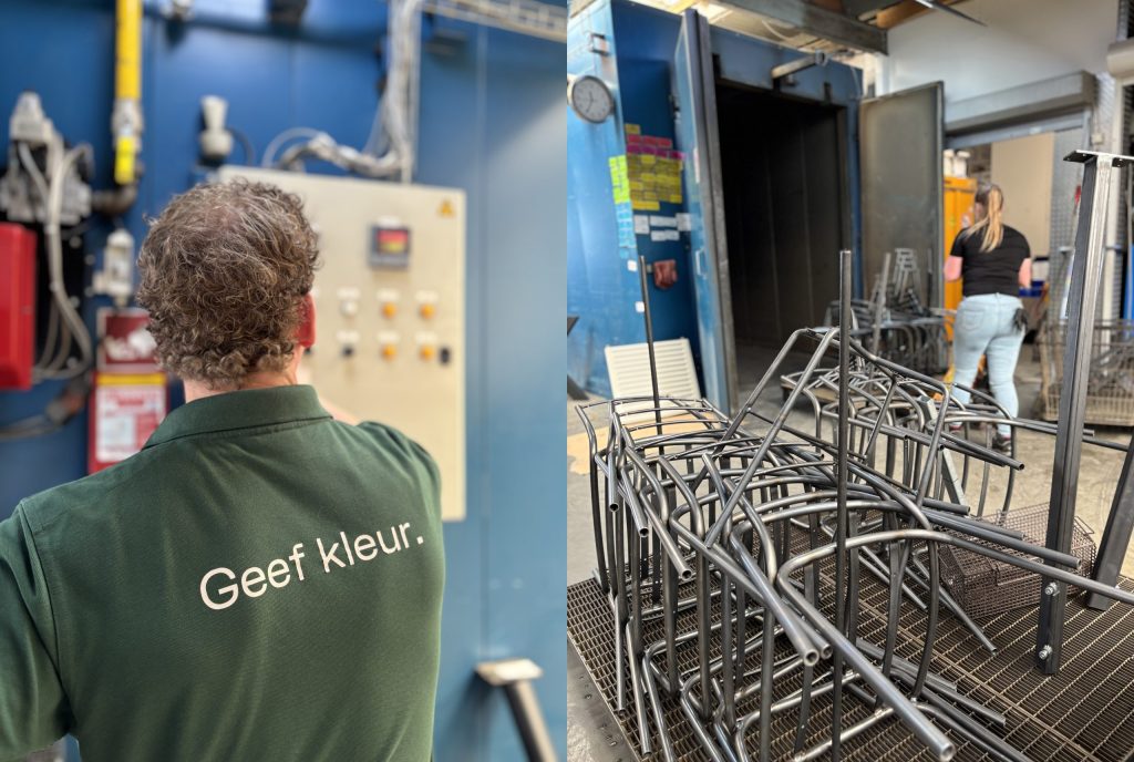 Het is passen en meten in de productiehal van Meja. Bij de ene roldeur staan metalen frames, platen en buizen klaar om vetvrij gemaakt te worden. Behendig rijden medewerkers de onderdelen vervolgens naar een carrousel met aangrenzend grote en kleine cabines, waar de poeders erop worden gespoten. Dan nog de oven in, en voilà: de strakke, slijtvaste coating is klaar. Tim: “Het staat vol. En dan is het vandaag nog niet eens héél druk.”