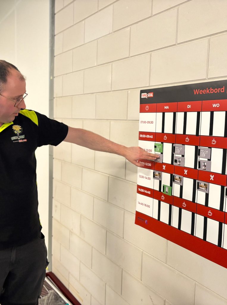 De oplossing bleek praktisch. Bibiche en Daniël schreven alle belangrijke handelingen uit en ontwikkelden een visueel planbord met pictogrammen. Elke collega heeft zo’n bord, naast elkaar in de productiehal. Daarop staat per week wie welke taken uitvoert: van routinetaken zoals opruimen en schoonmaken tot technische handelingen zoals start- en stopprocedures, storingen oplossen en machines opnieuw opstarten. Taken die eerder bij de techneut lagen. Het bord zorgt voor structuur en overzicht.
